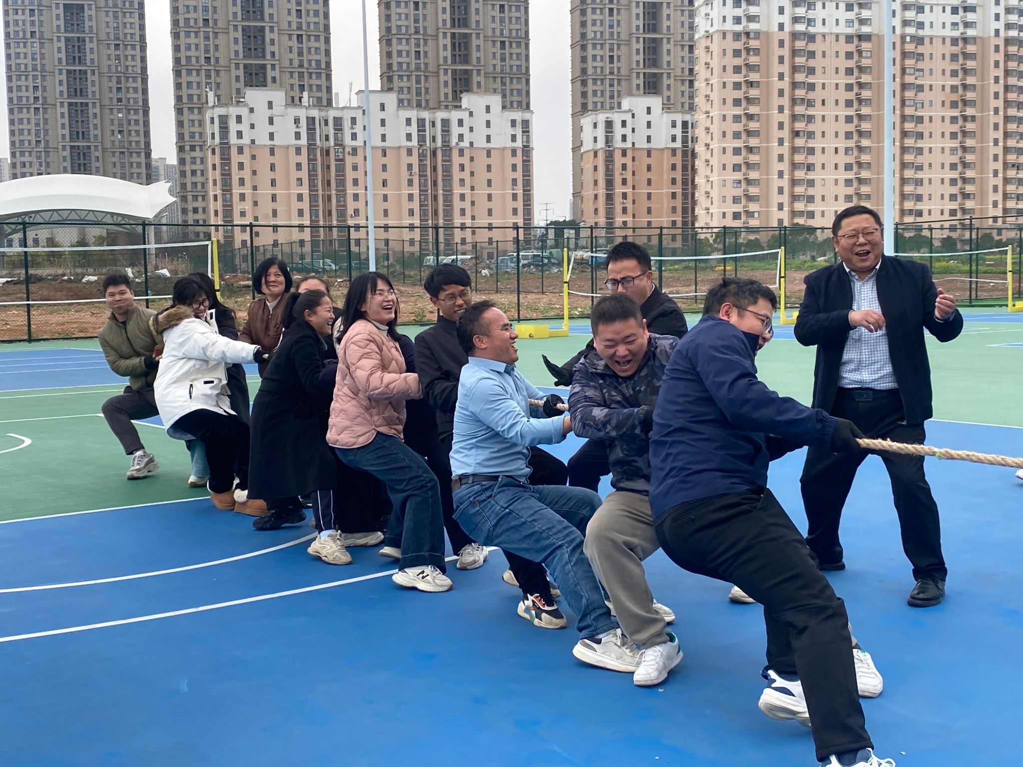 赛场上,来自江西医学院机关、焕奎书院、生物医学创新研究院、转化医学研究院、生物医学测试中心、临床医学实验中心的队员们紧握绳索、齐心协力,伴着整齐口号奋勇拼搏,每一次发力都彰显团结力量;场下,啦啦队员呐喊助威、掌声不断,热烈高涨的氛围充盈整个赛场。