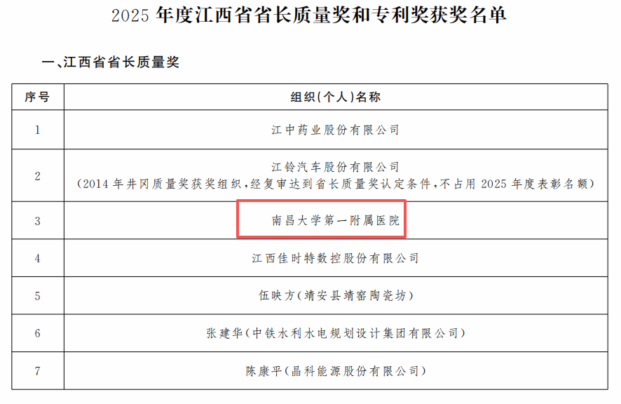 南昌大学第一附属医院荣获2025年度江西省省长质量奖!全省医疗卫生唯一!
