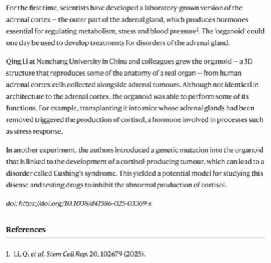 Following the publication of this work, it was highlighted by Nature magazine. In an article titled Gland-in-a-dish secretes stress hormone like the real thing,it was noted: Scientists have grown the adrenal cortex in the lab for the first time. This is the outermost layer of the adrenal gland, which produces essential hormones that regulate metabolism, handle stress and modulate blood pressure. One day, such organoids might be used to treat adrenal disease... Nanchang University used human adrenocortical cells collected from near adrenal tumors to cultivate adrenocortical organoids. The findings are a model with huge potential that can be used to study this disease and test new drugs to suppress abnormal cortisol secretion.