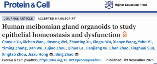 Zhao Bings team achieved a significant breakthrough in research on meibomian gland organoids and dry eye disease models. They published a research article in Protein & Cell titled Human meibomian gland organoids to study epithelial homeostasis and dysfunction.They constructed, de novo, mouse and human meibomian gland organoids capable of long-term stable expansion, fully recapitulating the meibomian gland cell lineage and lipid secretion function in vitro.
