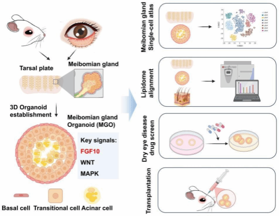 The meibomian gland organoids and dry eye disease models constructed in this study provide important model tools for delving into meibomian gland physiological and pathological mechanisms, accelerating drug development in the field of dry eye disease, and exploring meibomian gland regenerative medicine.