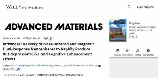 On May 22, a collaborative study by Luo Tao's team from our institute and Professor Wang Xiaolei's team from the Institute of Translational Medicine at Nanchang University was published in Advanced Materials (IF: 29.4). The paper is titled "Intranasal Delivery of Near-Infrared and Magnetic Dual-Response Nanospheres to Rapidly Produce Antidepressant-Like and Cognitive Enhancement Effects."